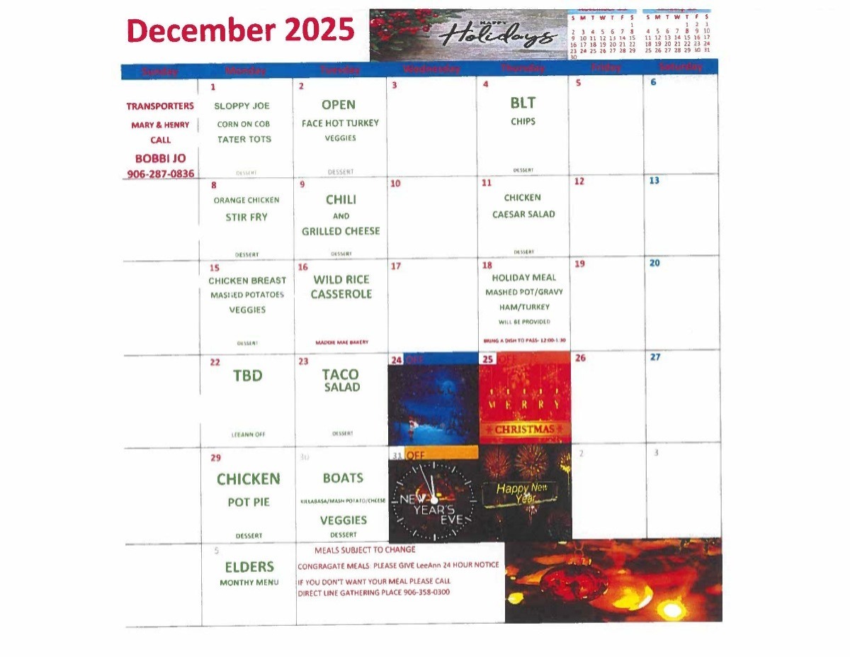 Please view the Elders Monthly Menu, meals may change due to substitutions. Meals are available for DINE-IN and Homebound Delivery only. We are funded by Inter-tribal council of Michigan, and we follow their guidelines. We have Congregate Meals on Monday, Tuesday & Thursday from 11:00 am – 1:00 pm CST at the Gathering Place. Elders eat first and then guests.